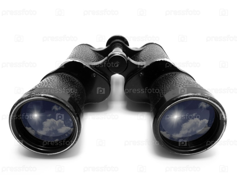 Старый бинокль, в котором отражается небо, на белом фоне