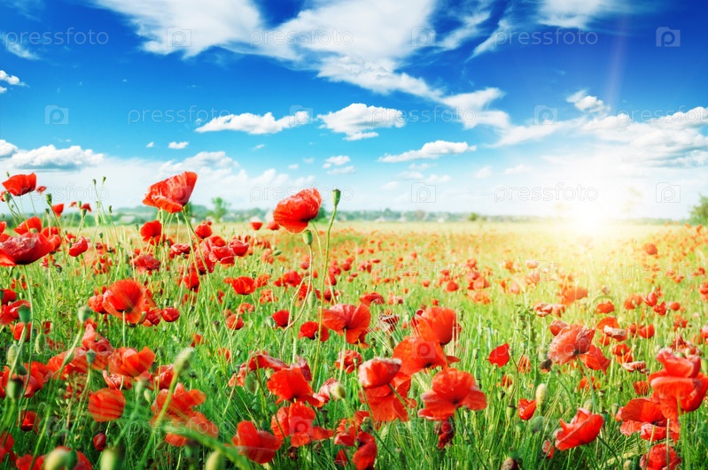 Поле маков в лучах солнца