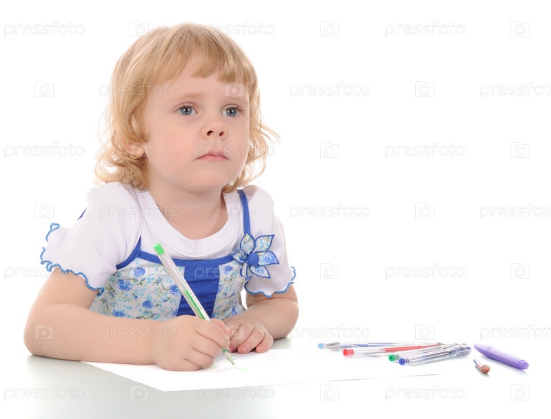 Маленькая девочка, рисующая цветными ручками на белом фоне
