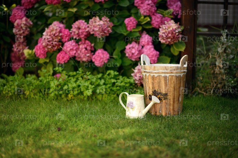 Ведро, лейка и цветущий куст