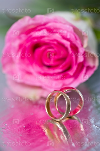 Золотые обручальные кольца и роза