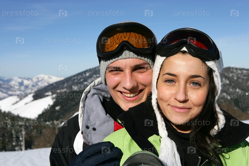Молодая пара катается на лыжах