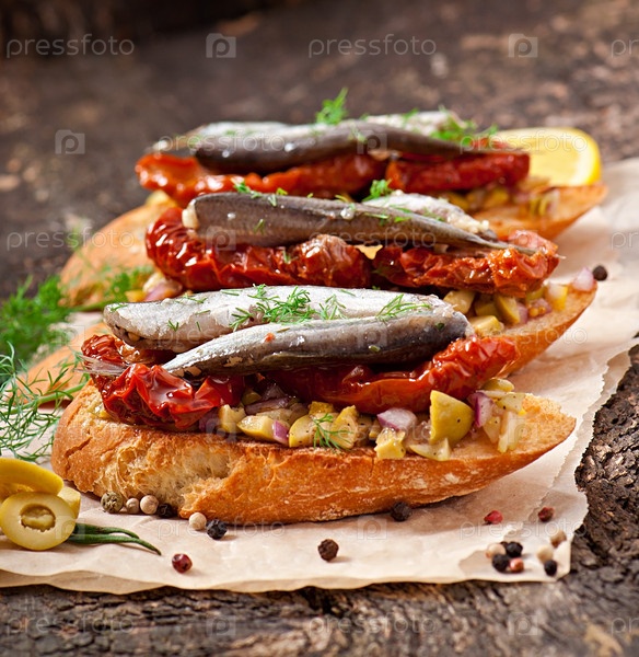 Кростини с анчоусами, маслинами и вялеными помидорами