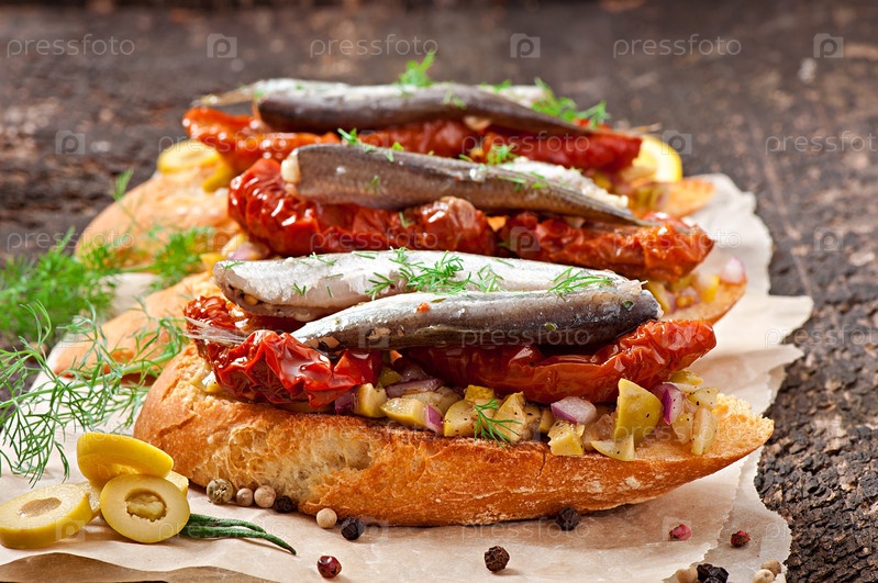 Кростини с анчоусами, маслинами и вялеными помидорами
