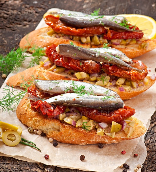 Кростини с анчоусами, маслинами и вялеными помидорами