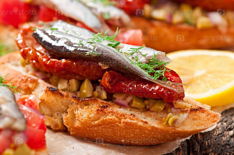Кростини с анчоусами, маслинами и вялеными помидорами