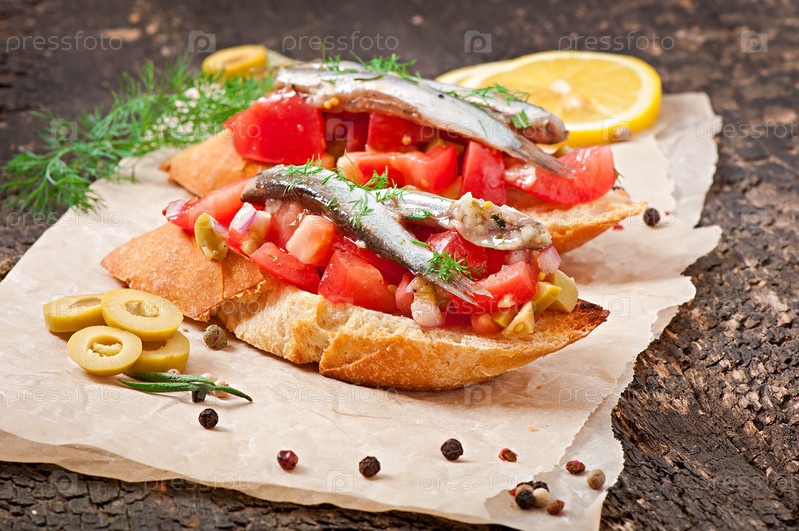 Кростини с анчоусами, маслинами и вялеными помидорами