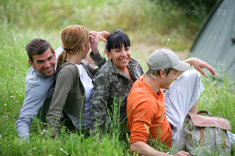 Четверо друзей лежат в траве