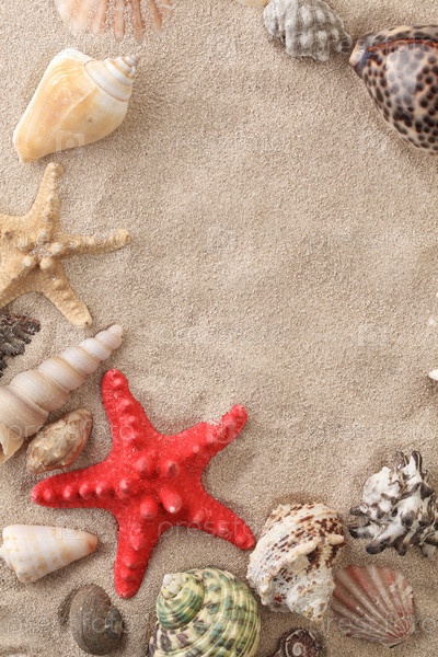 Морские звезды и ракушки на песке