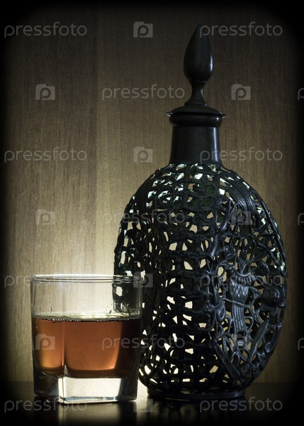 Рюмка коньяка и дорогая антикварная бутылка на фоне деревянной поверхности
