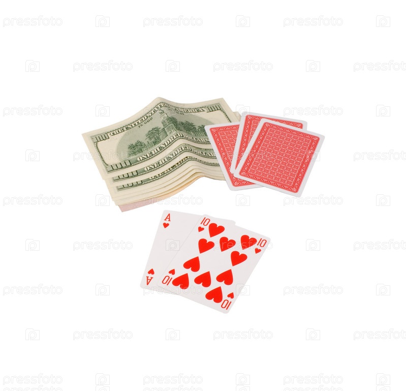 Стодолларовые купюры и комбинация карт двадцать один на белом фоне