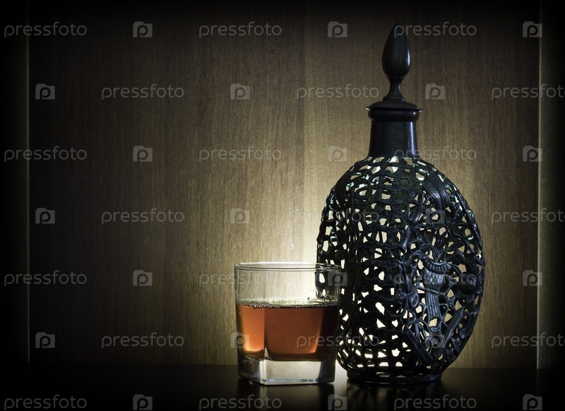 Рюмка коньяка и дорогая антикварная бутылка на фоне деревянной поверхности