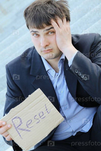 Молодой бизнесмен сидит на ступеньках здания с картонкой в руках с надписью "Повторный запуск"