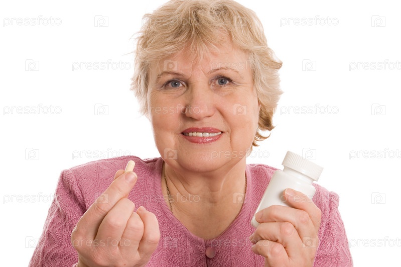 Портрет пожилой женщины с таблетками на белом фоне