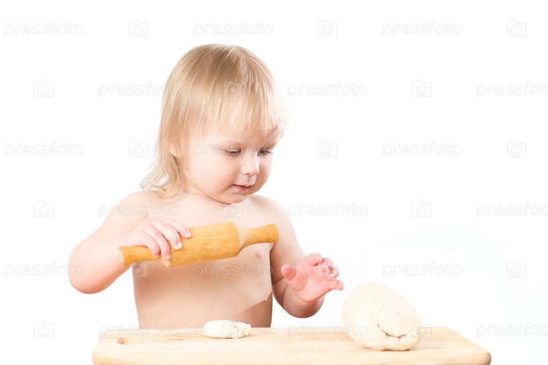 Маленькая девочка со скалкой собирается раскатать кусочек теста