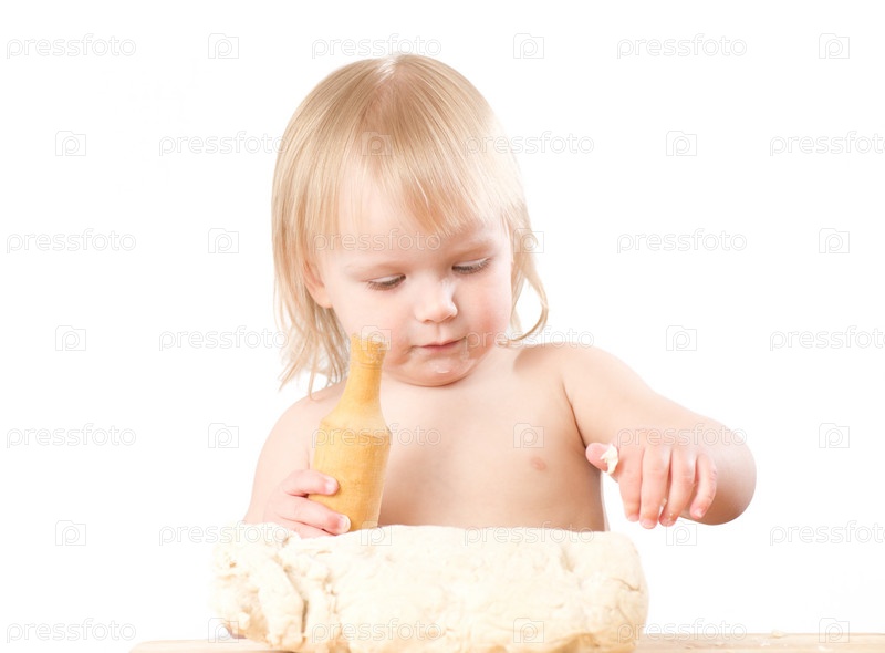 Маленькая девочка со скалкой и тестом на белом фоне