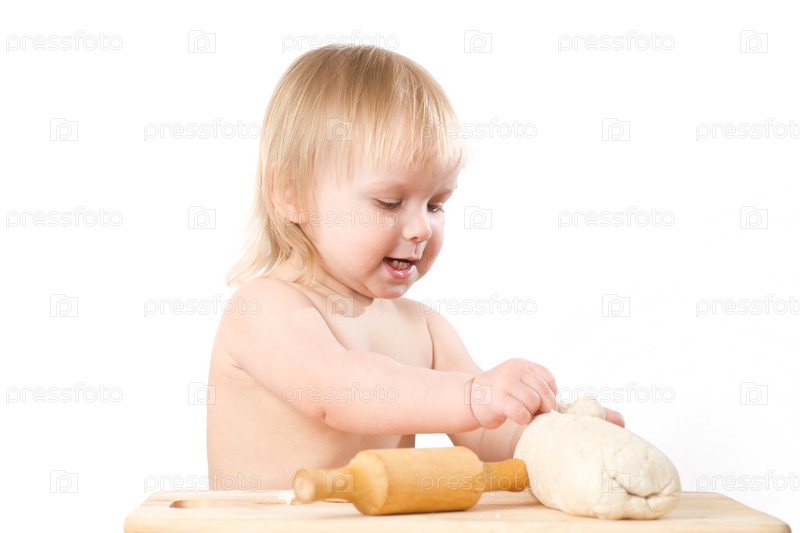 Маленькая девочка со скалкой и тестом на белом фоне