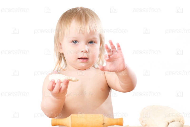 Маленькая девочка со скалкой и тестом на белом фоне