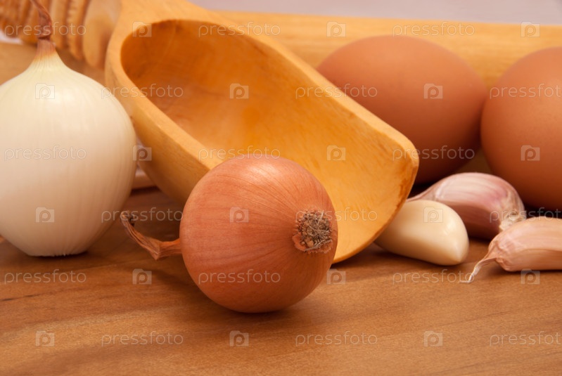 Лук, яйца, чеснок и совок на кухонном столе