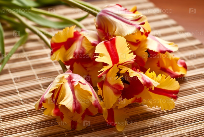 Букет желто-красных тюльпанов на бамбуковой салфетке