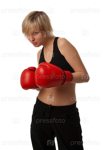 Спортивная девушка в красных боксерских перчатках на белом