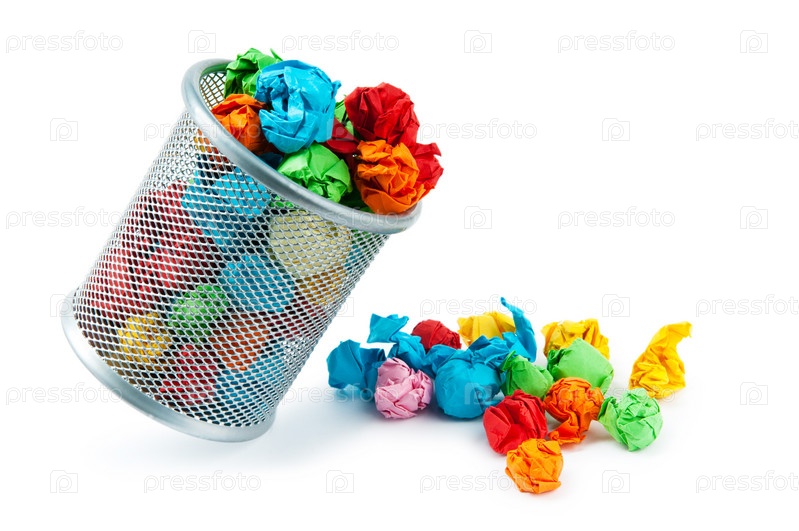 Мусорное ведро с мятой разноцветной бумагой