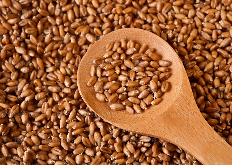 Деревянная ложка на фоне проросших зерен пшеницы