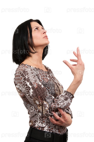Задумчивая женщина на белом фоне