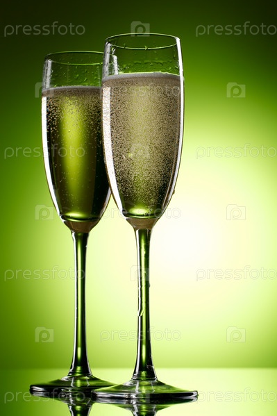 Два бокала шампанского на зеленом фоне