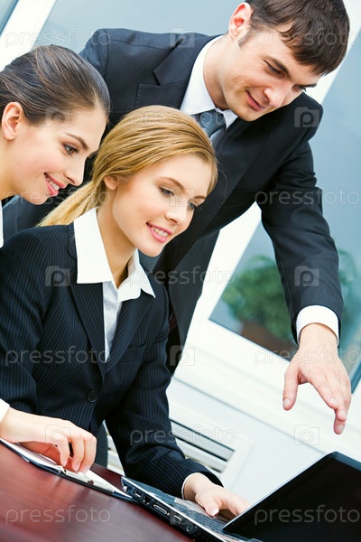 Изображение бизнесмена, указывающего на ноутбук с двумя женщинами рядом