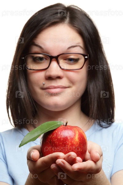 Красивая девушка в очках с яблоком в руке на белом фоне
