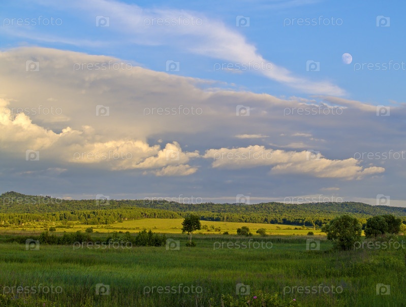 Зеленый луг и облачное небо