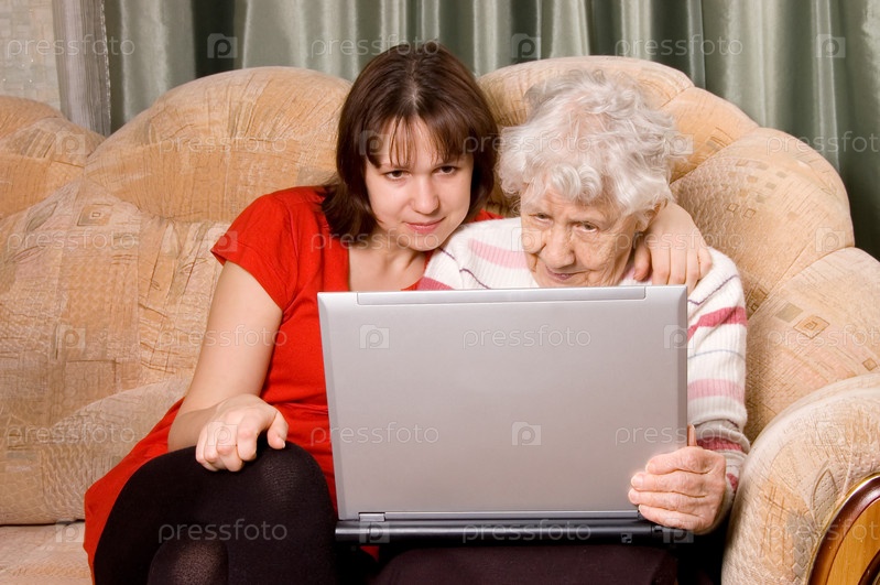 Бабушка с внучкой, сидящие на диване с ноутбуком