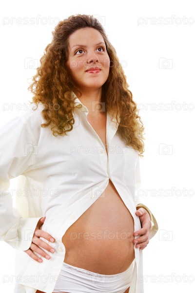 Портрет счастливой беременной женщины на белом фоне