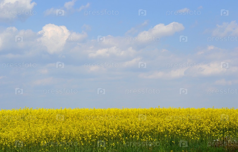 Бескрайнее поле цветущего рапса и голубое небо