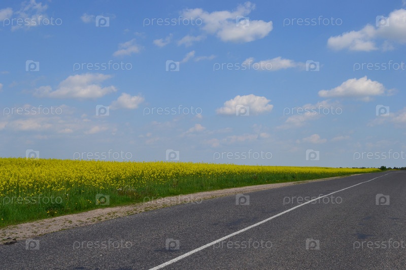 Бескрайнее поле цветущего рапса и дорога