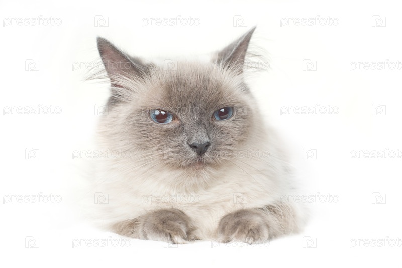 Портрет спокойной пушистой голубоглазой кошки