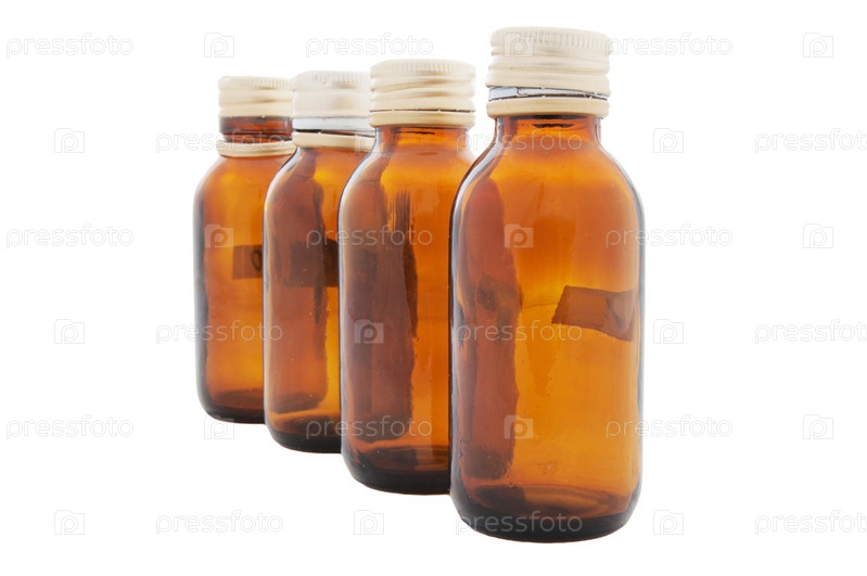 Четыре медицинских коричневых пузырька на белом фоне