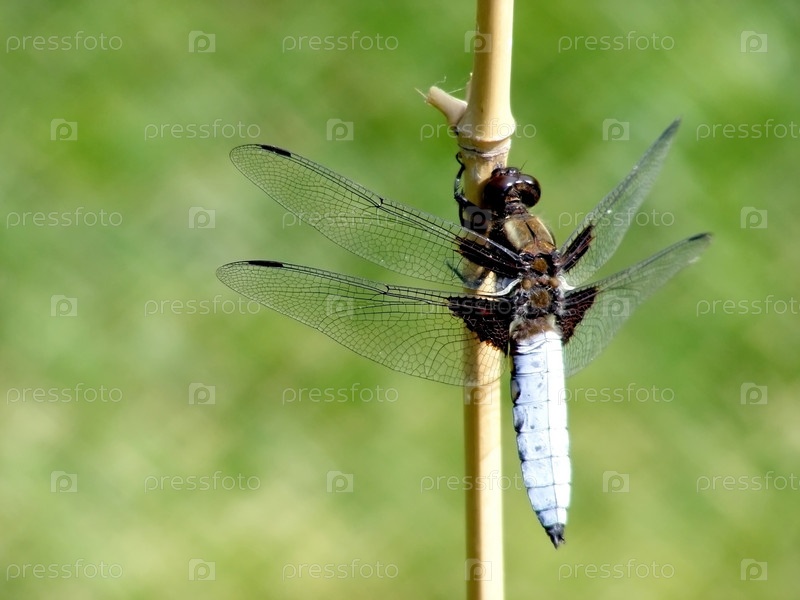 Стрекоза сидит на ветке бамбука на зеленом фоне в солнечный день
