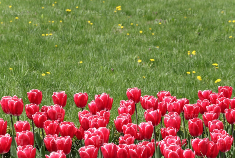 Красные тюльпаны весной в городском парке