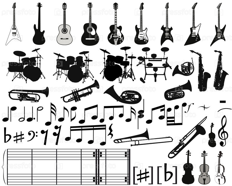 Черные музыкальные инструменты и ноты на белом фоне
