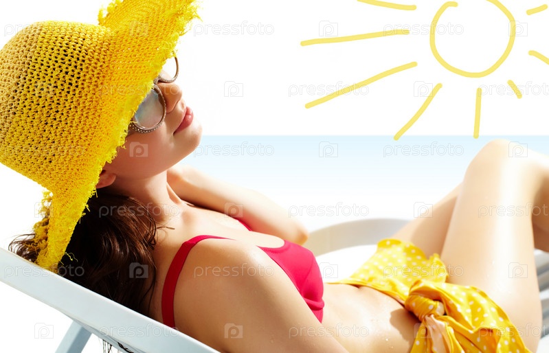 Девушка в широкополой шляпе и очках загорает в шезлонге