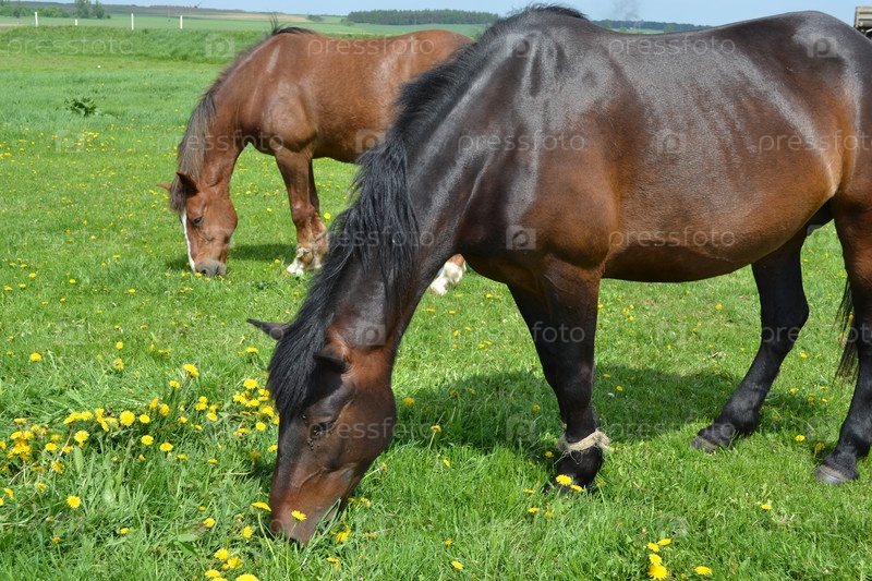 Лошади щиплют траву на лугу