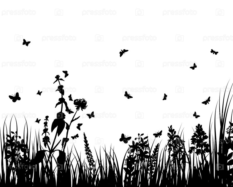 Черные очертания травы и бабочек на белом фоне