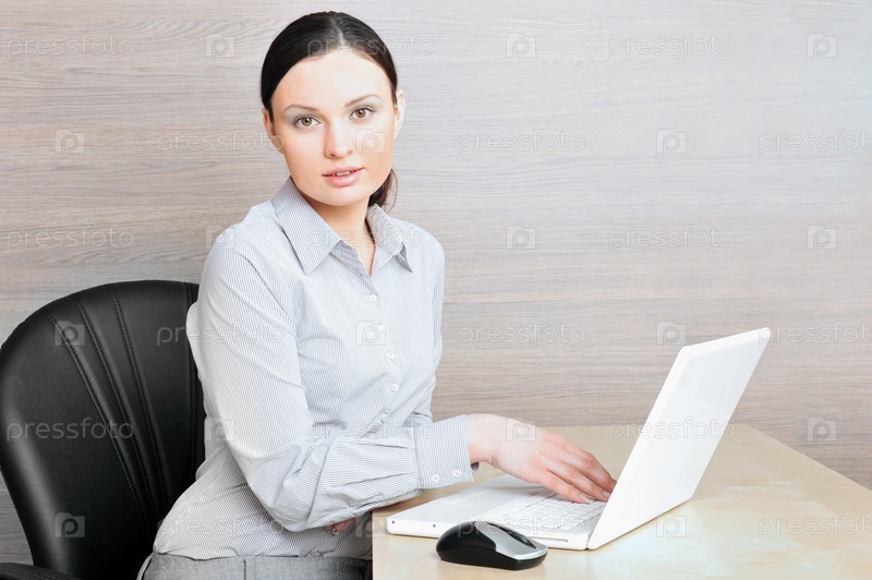 Портрет красивой молодой предпринимательницы с ноутбуком