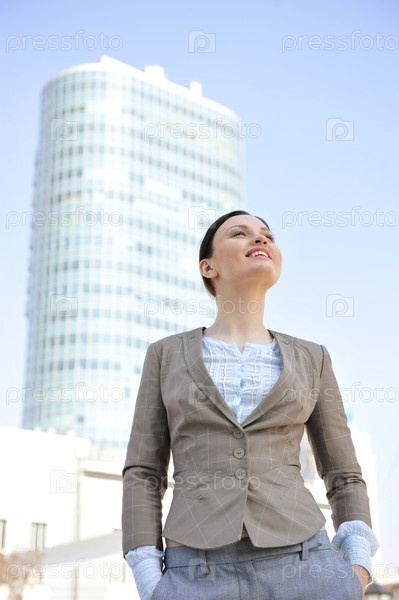 Портрет красивой молодой предпринимательницы на фоне многоэтажного офисного здания