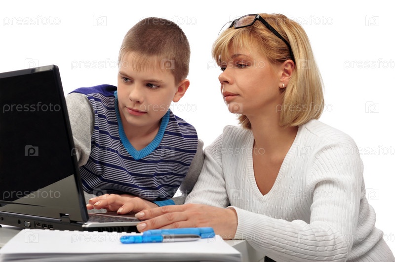 Мать с сыном вместе делают домашнее задание на ноутбуке