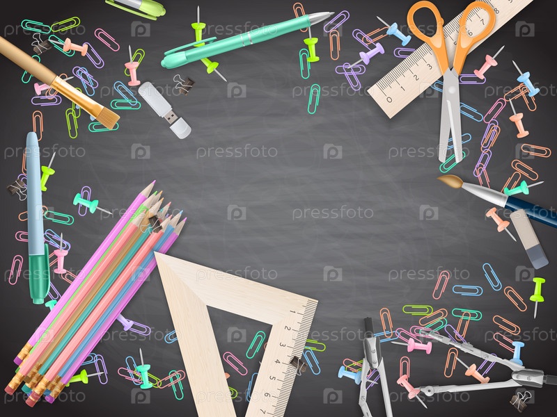 Школьные принадлежности на фоне доски. EPS 10