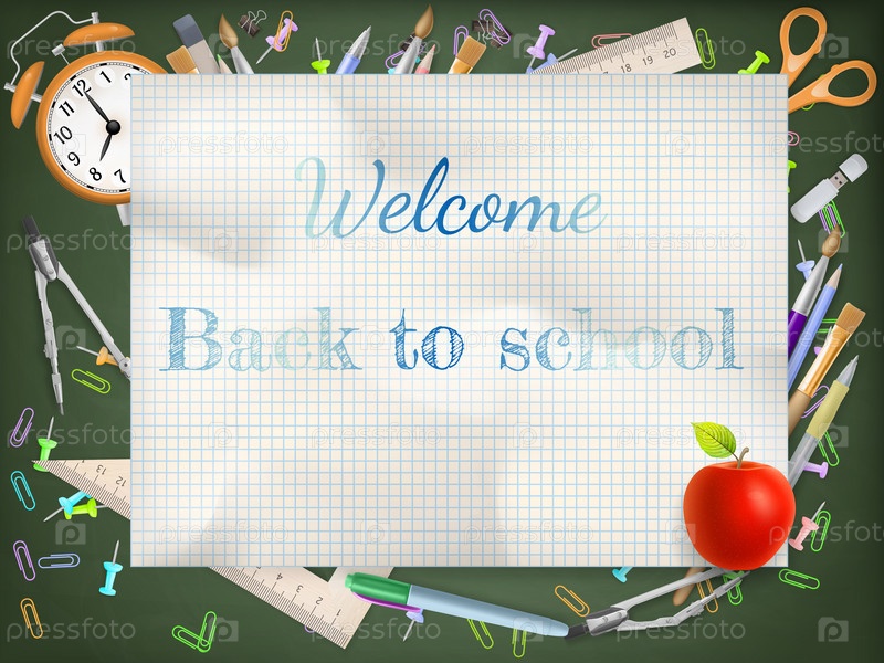 Фраза 'Назад в школу' на листе тетради. EPS 10