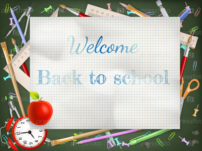 Фраза 'Назад в школу' на листе тетради. EPS 10